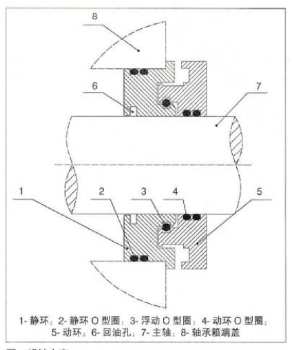 軸承箱隔離器是近十年出現(xiàn)的新型密封產(chǎn)品,是在復(fù)合迷宮密封的基礎(chǔ)上發(fā)展起來的一種非接觸密封形式。其機構(gòu)由靜環(huán)、動環(huán)、浮動環(huán)組合而成,靜環(huán)阻止?jié)櫥托孤┎в谢赜涂?,動環(huán)防止外界污染物進(jìn)人軸承箱。浮動環(huán)連接動環(huán)與靜環(huán),將其鎖定為一個整體,這個整體結(jié)構(gòu)同時具有蒸汽阻隔作用。動環(huán)和靜環(huán)上使用的是O型圖密封,軸承隔離器是一種非接觸、無磨損的軸承保護(hù)裝置。當(dāng)設(shè)備運行時,動靜環(huán)之間不接觸,所以沒有功率損耗,同時利用自身結(jié)構(gòu)特點防止漏油。